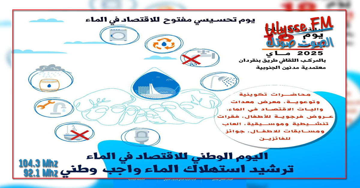 وتضمن اليوم المفتوح محاضرات توعوية وتكوينية ومعرض معدات واليات الاقتصاد في الماء إضافة الى عروض فرجوية ومسابقات للأطفال وفقرات تنشيطية موسيقية.