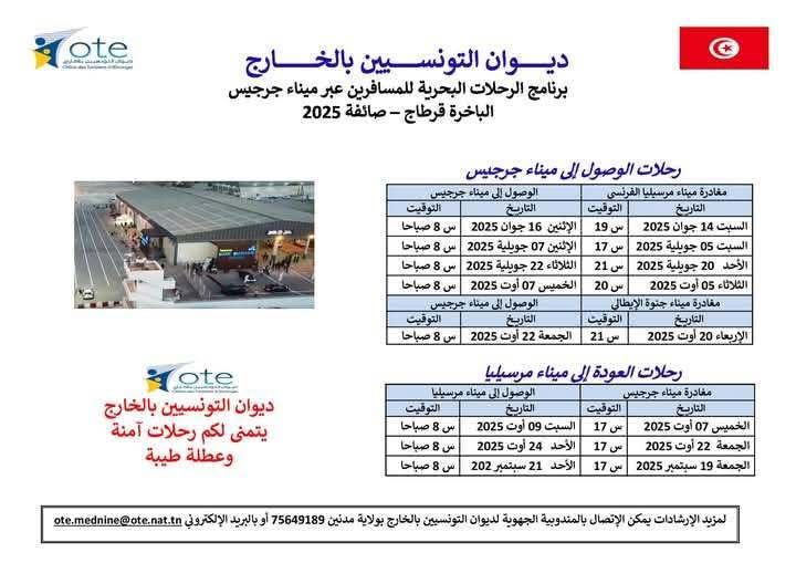 يستقبل ميناء جرجيس يوم 16 جوان الجاري، أولى الرحلات البحرية للمسافرين المقيمين بالخارج على متن الباخرة قرطاج، حيث من المقرر وصولها على الساعة الثامنة صباحا، وذلك من ضمن خمس رحلات مبرمجة هذه الصائفة عبر ميناء جرجيس، اربع رحلات منها قادمة من ميناء مرسيليا الفرنسي ورحلة وحيدة قادمة من ميناء جنوة الإيطالي.