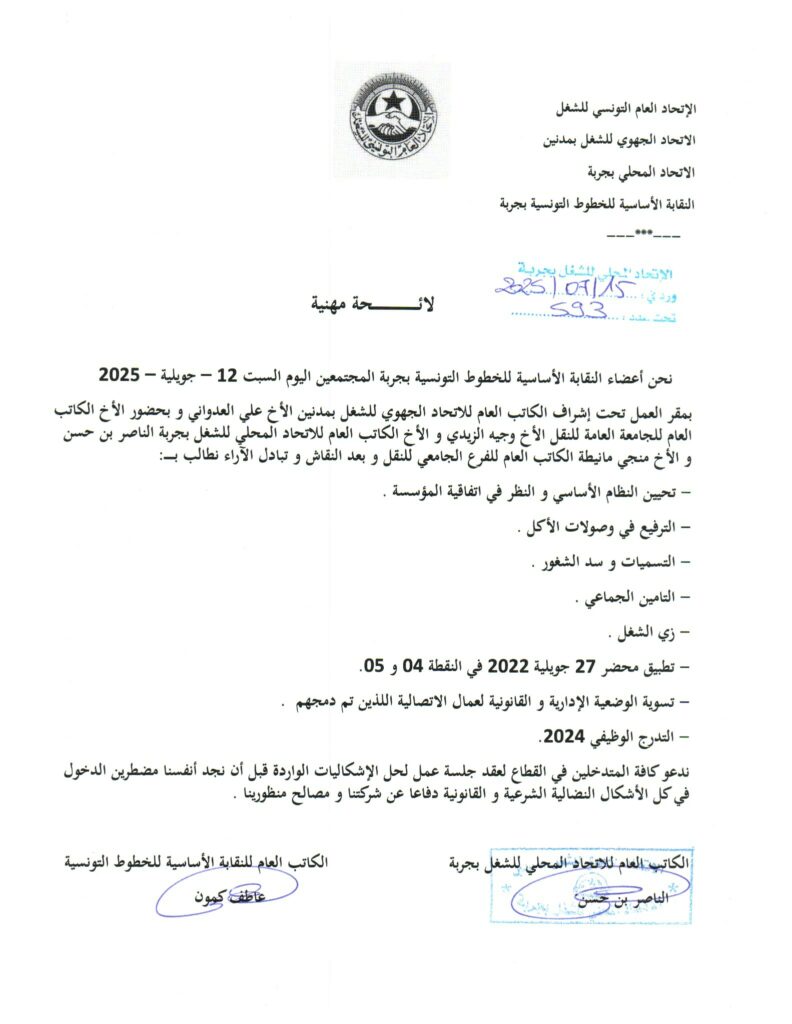 أصدرت النقابة الأساسية للخطوط الجوية التونسية بجربة لائحة مهنية و ذلك اثر اجتماعها يوم السبت الفارط ضمنتها جملة من المطالب على غرار تحيين النظام الأساسي و النظر في اتفاقية المؤسسة، الترفيع في وصولات الاكل، التسميات و سد الشغور ، التامين الجماعي و زي الشغل ، تطبيق محضر 27 جويلية 2022، إضافة الى تسوية الوضعية الإدارية و القانونية لعمال الاتصالية اللذين تم دمجهم و التدرج الوظيفي