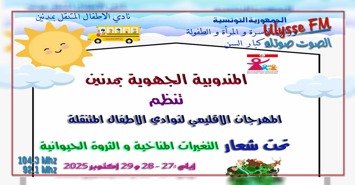 تنطلق اليوم بولاية مدنين الدورة الأولى للمهرجان الاقليمي للنوادي المتنقلة الراجعة بالنظر لوزارة الأسرة والمرأة والطفولة وكبار السن تحت شعار التغيرات المناخية و الثروة الحيوانية لتتواصل الى غاية 29 أكتوبر 2025: