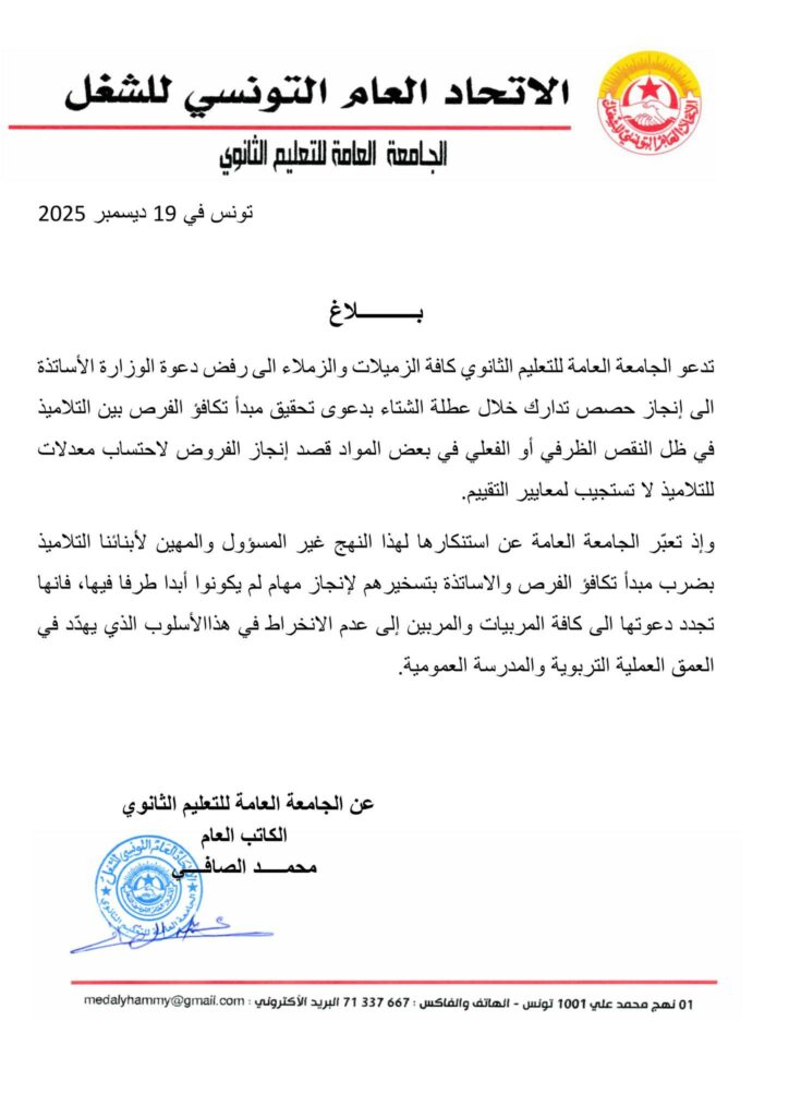 دعت الجامعة العامة للتعليم الثانوي كافة الأساتذة الى رفض دعوة وزارة التربية الى انجاز حصص تدارك خلال عطلة الشتاء بدعوى تحقيق مبدا تكافئ الفرص بين التلاميذ في ظل النقص الظرفي او الفعلي في بعض المواد قصد انجاز الفروض لاحتساب معدلات للتلاميذ لا تستجيب لمعايير التقييم.