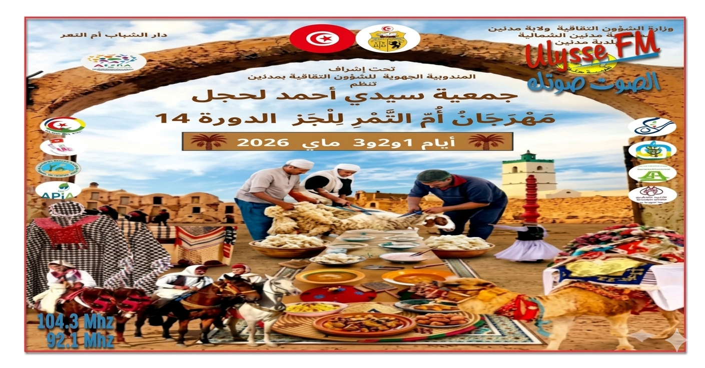 الاستعدادات من جمعية سيدي احمد لحجل ودار الشباب ام تمر وتحت اشراف المندوبية الجهوية للشؤون الثفافية بمدنين لتنظيم الدورة 14 لمهرجان أم التمر للجز الذي تقرر تنظيمه أيام 1 و2 و3 ماي 2026 .وفي مايلي برنامج هذه التظاهرة **الجمعة 1ماي 2026 س 9:00 افتتاح – معرض منتوجات فلاحيه بيولوجية محلية- معرض منتوجات غذائية محلية- معرض الصناعات التقليدية والحرف اليدويةس 15:00 ندوة علمية: “تحسين نظم الأعلاف للمجترات الصغرى”• ورشة جز17:00 عرض الافتتاح:• تجسيم عرس تقليدي “كسوة”• فرقة سلامية• شعر شعبي• فرقة فنون شعبية• عرض راقص بالجرار والسلالمس 20:00 سهرة فنية تراثية للشاعر فوزي بوقارص اما اليوم الثاني فيتضمن – معارض منتوجات فلاحيه – معارض صناعات تقليدية – معرض منتوجات غذائية محلية• ورشة جز• مسابقات الطبخ التقليدي “اليوم غدانا عيش” “الزميطة ” مكون غذائي متكامل• س 15:00 ابداعات شبابية و مدرسية – تدشين جدارية الفنون التشكيلية “لوحة المهرجان”العاب الرماية بالقوس و السهم- س 20:00 سهرة فنية “مسرحية الجدار” لكريم الخرشوفيوبخصوص اليوم الثالث فسبكون البرنامج كما يلي – المكان أمام مقر الجمعية بأم التمرس 9.00 حملة لتلقيح الكلاب والحيوانات الأليفة -المكان وادأم التمر-س 16:00 عرض ثقافي عرس تقليدي “جحفة “-فرقة فنون شعبية-عقد فروسية -فارس مداوري- مسابقات الصيد بالسلوقي س 21:00 سهرة فنية عرض “بصمة” للفنان محمد الهنتاش واختتام المهرجان .